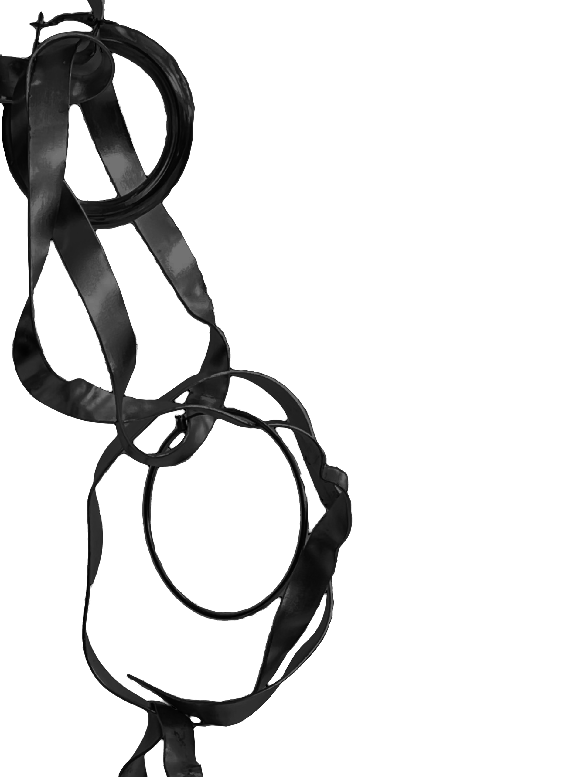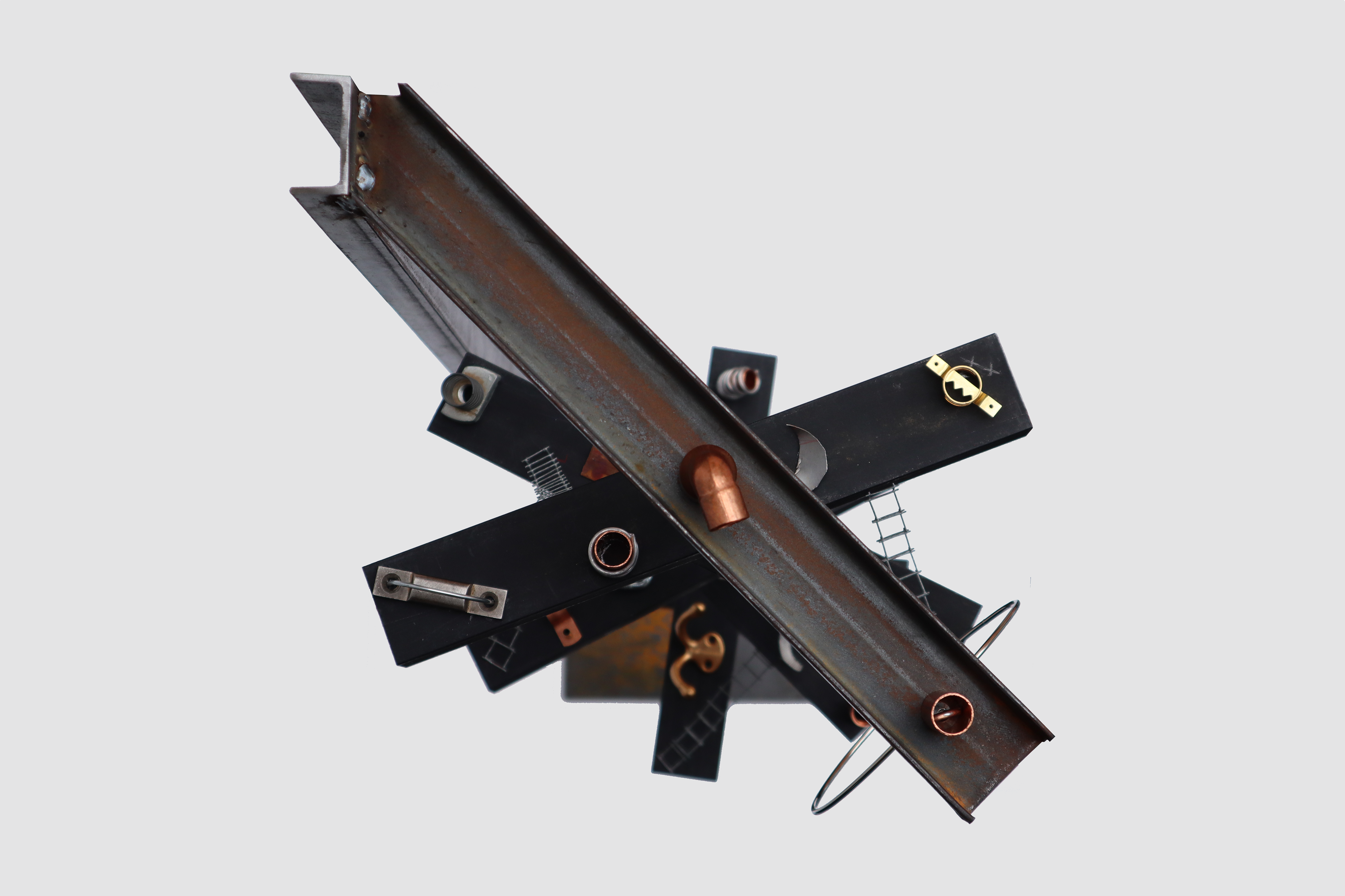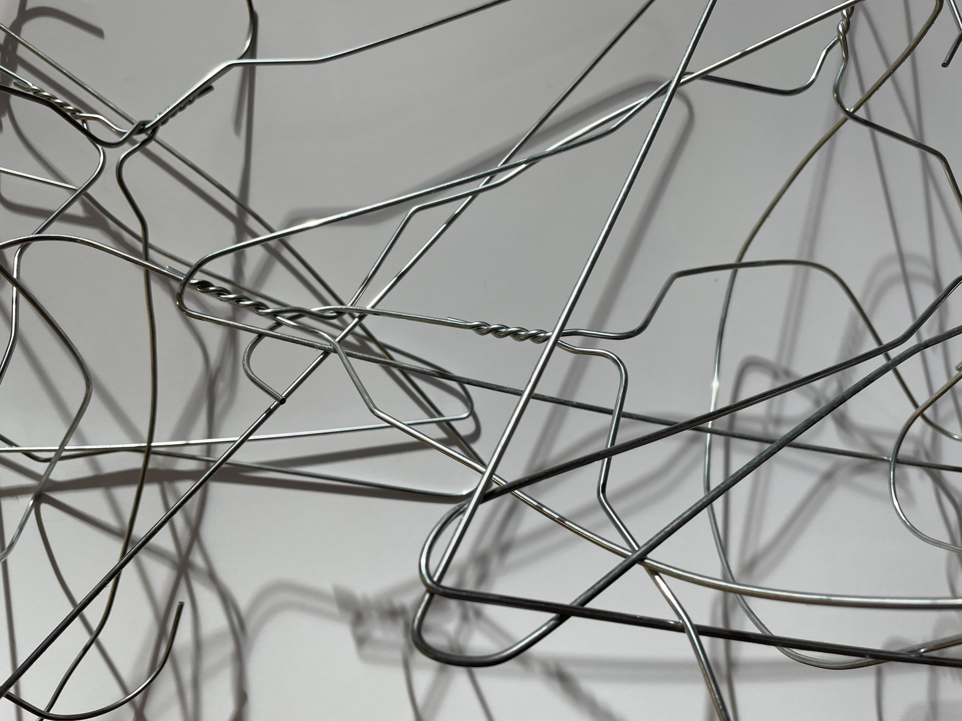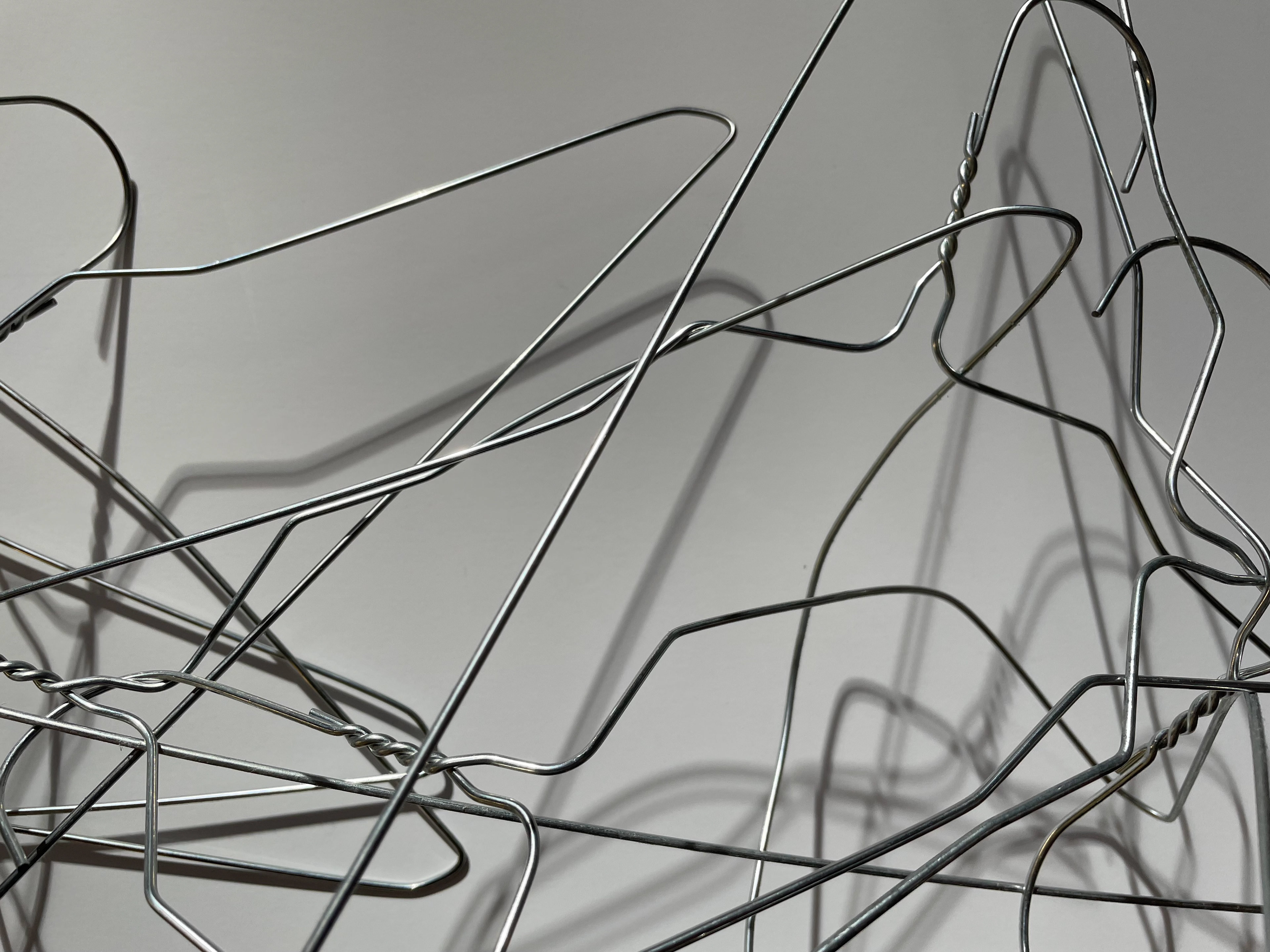 My exploration began with scavenged scrap metal—steel, copper, aluminum, brass, even wire hangers—guided by a fascination with overlooked beauty and the wabi-sabi philosophy of finding elegance in imperfection. As I bent and twisted these fragments into delicate display models for hoops and chains, I began to see echoes of the jewelry I collect: ornamental objects that pierce, hang, and clasp with both fragility and strength. These studies grew in scale and ambition, culminating in a 2.5-foot suspended ear sculpture pierced like jewelry and, eventually, the Pierced Mass—a hanging tower of welded steel waste pierced by cable. At once ornamental and precarious, it spins in the air like an architectural earring: sharp, heavy, and risky. This process marked my entry into metalwork, where sawing, welding, and drilling steel revealed not only the physicality of craft but also the latent potential of discarded material to become both structure and ornament.