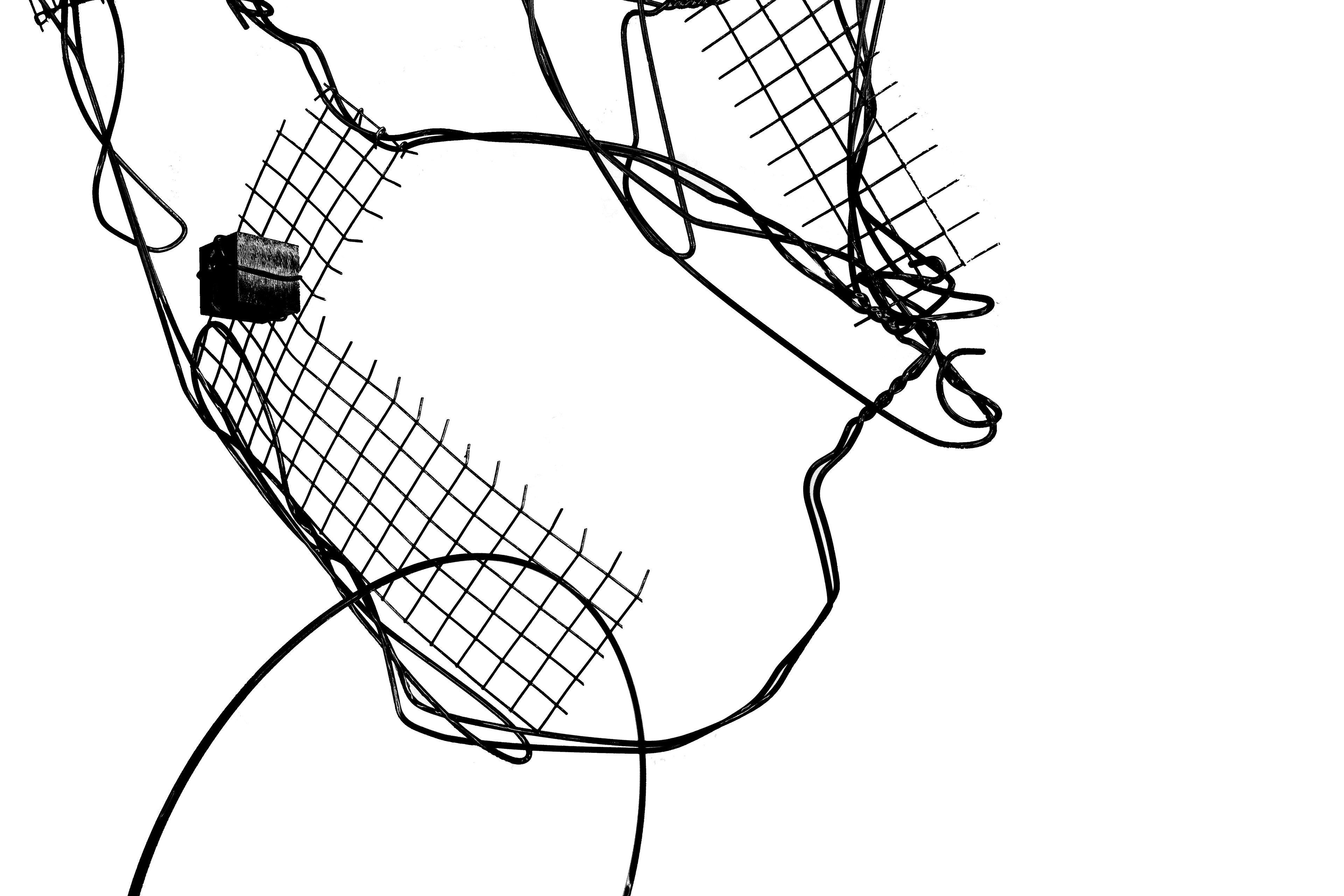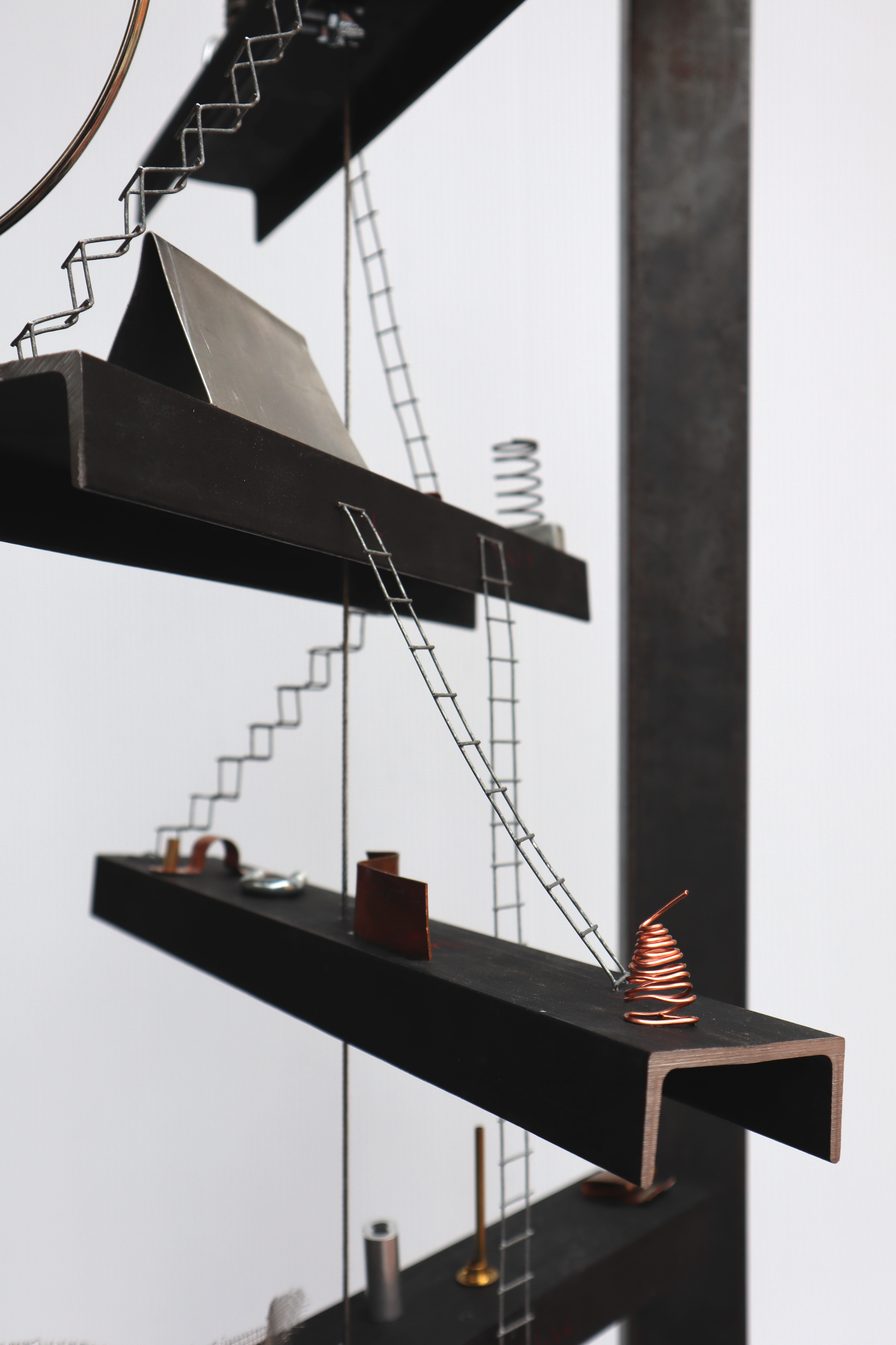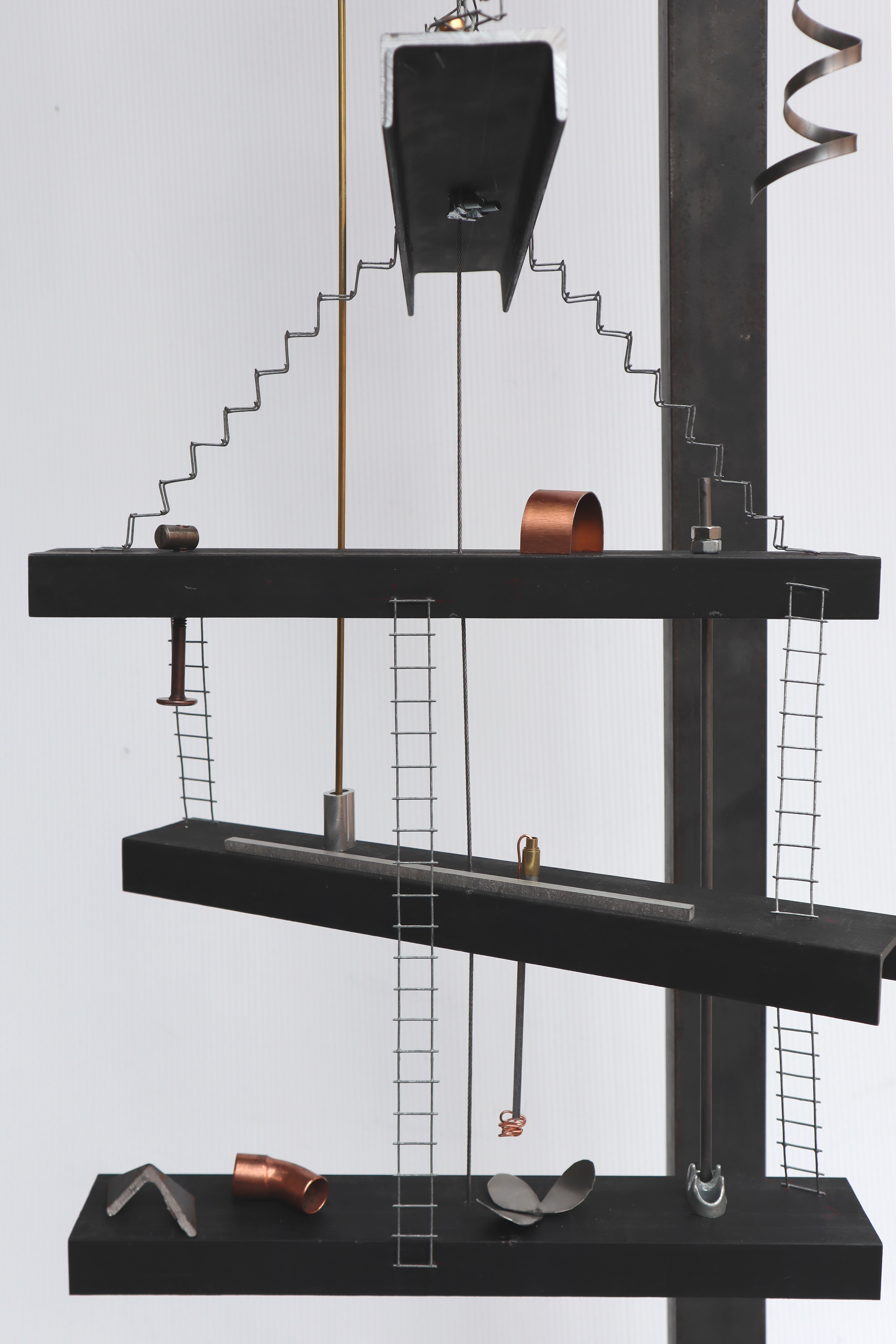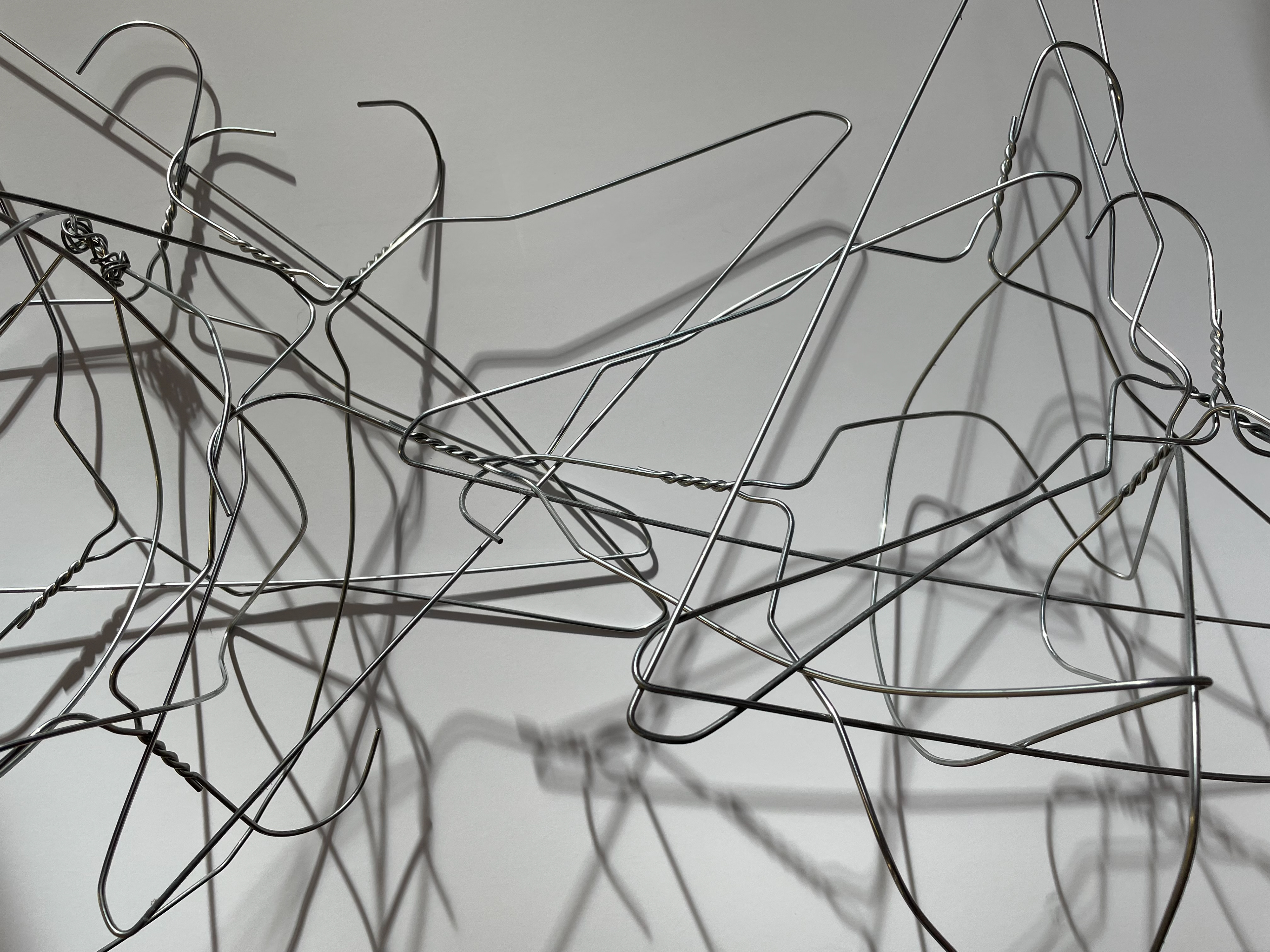 My exploration began with scavenged scrap metal—steel, copper, aluminum, brass, even wire hangers—guided by a fascination with overlooked beauty and the wabi-sabi philosophy of finding elegance in imperfection. As I bent and twisted these fragments into delicate display models for hoops and chains, I began to see echoes of the jewelry I collect: ornamental objects that pierce, hang, and clasp with both fragility and strength. These studies grew in scale and ambition, culminating in a 2.5-foot suspended ear sculpture pierced like jewelry and, eventually, the Pierced Mass—a hanging tower of welded steel waste pierced by cable. At once ornamental and precarious, it spins in the air like an architectural earring: sharp, heavy, and risky. This process marked my entry into metalwork, where sawing, welding, and drilling steel revealed not only the physicality of craft but also the latent potential of discarded material to become both structure and ornament.